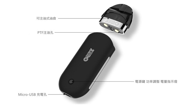 ZERO是一台POD型的設備,煙彈內部包含油倉和霧化芯,替換時須整組進行更換。材質方面使用的是通過美國FDA認證的PCTG安全材質,常使用於食品容器上,並對環境友善可進行分解,霧化芯則是採用自家專利的1.0歐姆CCELL陶瓷霧化芯,味道乾淨而且相當耐用。左側的柱油孔採用PTF技術,須將油瓶的針嘴對準油孔下壓,才可進行注油動作,完成後內部的矽膠環則會自動歸位封閉注油孔,確保煙液可以完全密封在油艙內以避免滲出。